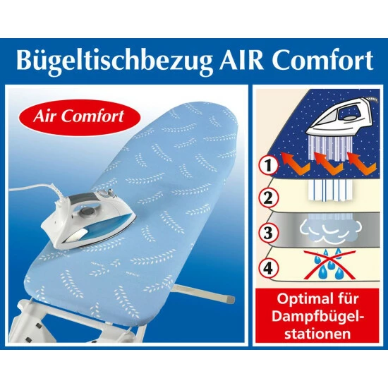 Das 5-lagige Hightech-Gewebe des Bügeltischbezugs AIR COMFORT in Blau-weiß reflektiert optimal Dampf und Hitze. Durch die in dem Gewebe enthaltene Aluminiumschicht und dem Dampf aus der Bügelstation bildet sich zwischen den einzelnen Lagen ein Luftpolster, das für besonders schonendes und komfortables Bügeln sorgt. Das Bügeleisen gleitet ‘wie auf Wolken’ und die Hitze wird zusätzlich reflektiert. Dies sorgt für ein extrem schnelles und glattes Bügelergebnis.