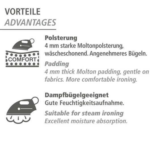 Dabei sorgt die separate 4 mm Molton-Polsterung des Bezuges für komfortables und wäscheschonendes Bügeln. Abgerundet wird der geniale Bügeltischbezug mit der oberen Schicht aus 100% Baumwolle. Der Bezug ist auch für den Einsatz von Dampfbügeleisen geeignet.