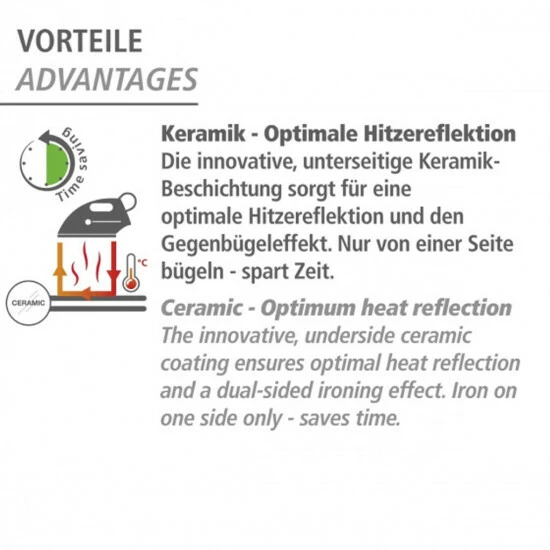 Die innovative, unterseitige Keramik-Beschichtung sorgt für optimale Hitzereflexion und spart dank Gegenbügeleffekt bis zu 50% Bügelzeit und Energie.