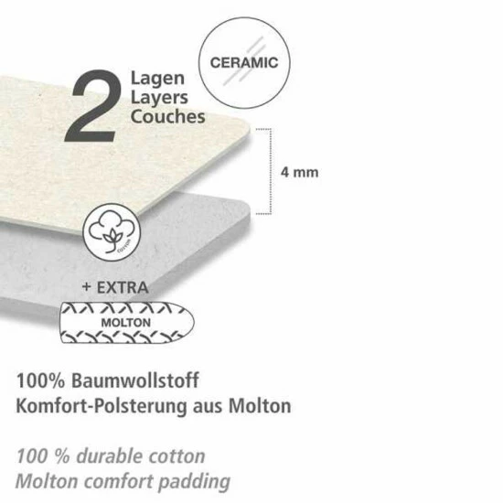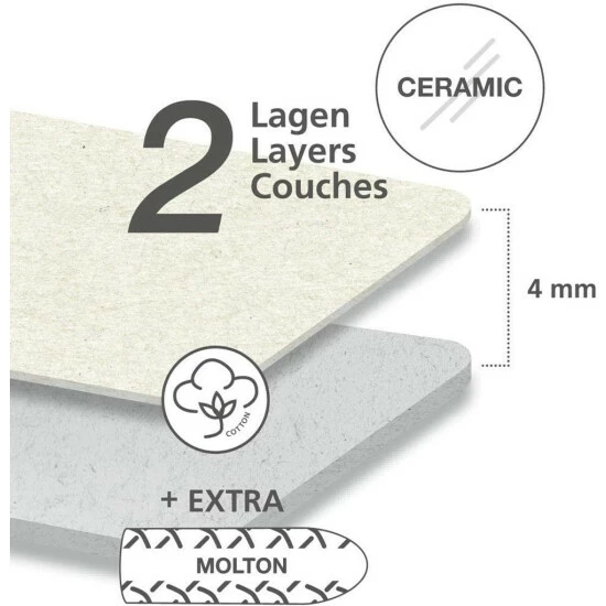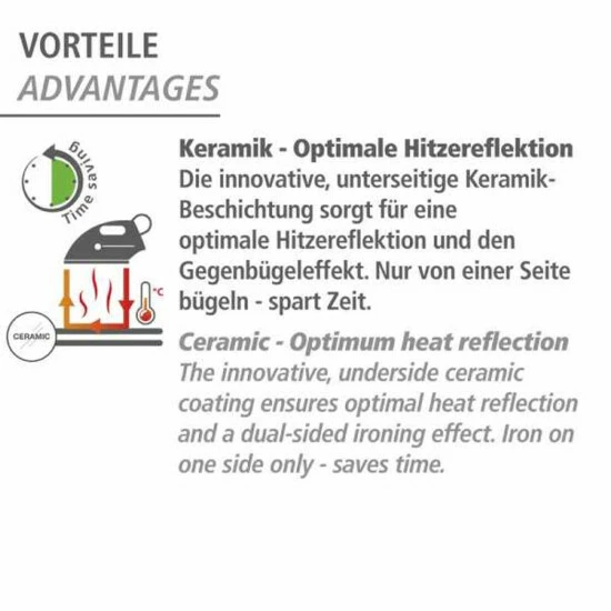1. Lage: 100 % Baumwolle mit Keramik-Beschichtung – sorgt für optimale Hitzereflektion und schnelleres, glatteres Bügeln. Nur von einer Seite Bügeln spart bis zu 50% Zeit!