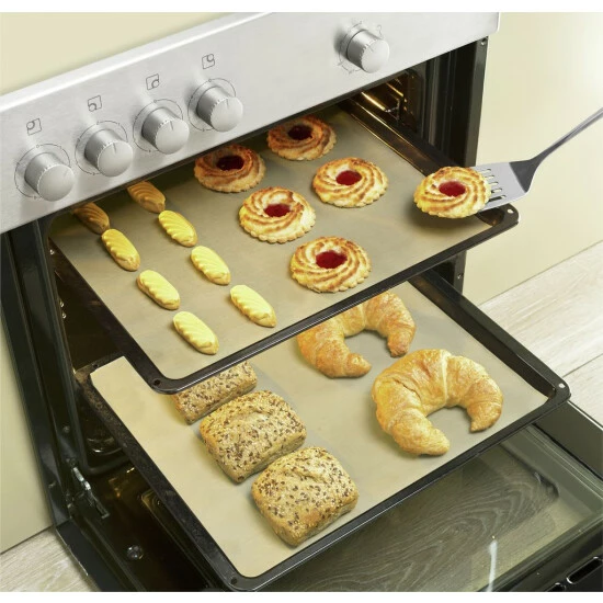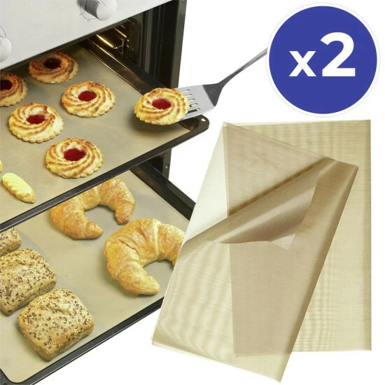 Diese umweltfreundlichen Dauerbackfolien können bis zu 1000 Mal wiederverwendet werden. Sie sind sehr reißfest, bis 260 °C hitzebeständig und spülmaschinengeeignet. Dank der Antihaft-Beschichtung backt nichts fest. Die Ränder der Folie fliegen beim Backen nicht nach oben. So bräunt alles gleichmäßig.
