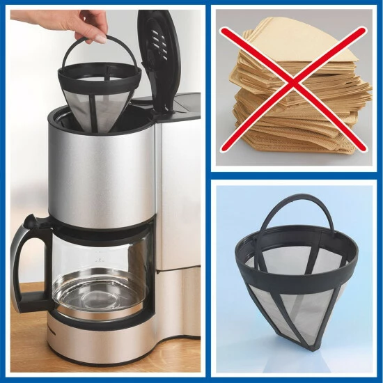 Filtertüten aus Papier haben ausgedient, denn der zweckvolle Dauer-Kaffeefilter macht endlich Schluss mit unnötigem Müll. Die mikrofeine Porenstruktur des hochwertigen Edelstahl-Filters sorgt für höchsten Kaffeegenuss bei sparsamen Kaffeeverbrauch. Nach Gebrauch können Sie den Dauer-Kaffeefilter einfach unter klarem Wasser ausspülen. Dieser Filter ist universal passend für alle gängigen Kaffeemaschinen oder als Hand-Kaffeefilter zu nutzen. Besonders praktisch auch im Büro, auf Reisen oder beim Camping.