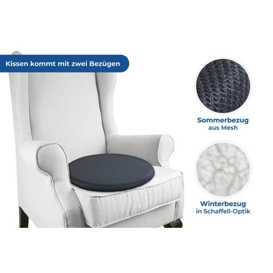 Das Drehkissen mit Wechselbezug ist die bequeme Alternative zu normalen Kissen. Mit diesem fällt das Ein- und Aussteigen zum Beispiel aus dem Auto viel einfacher und ohne Verrenkung. Einfach auf den gepolsterten Sitzkissen Platz nehmen und individuell in die gewünschte Position drehen. Das Kissen lässt sich um bis zu 360 Grad drehen, macht jede Bewegung mit und ist mit Anti-Rutsch-Unterseite. Auch bei langem Sitzen behält es hohen Sitzkomfort. Natürlich kann das Kissen auch für Sessel, Sofa und Betten genutzt werden. Die abgerundeten Ecken bieten bequemes Sitzen. Lieferung inklusive 2 Wechselbezügen 1x für Sommer und 1x für Winter. Belastbarkeit bis zu einen Körpergewicht von max. 150 kg.