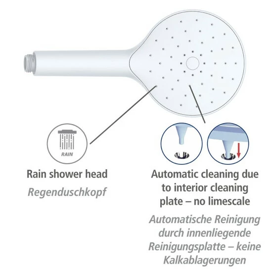 Verwöhnen Sie sich mit einer schönen Regendusche! Dieses Duschkopfmodell ist mit einem einzigartigen System ausgestattet, das durch eine innenliegende Reinigungsplatte Kalkablagerungen verhindert und die Düsen dauerhaft sauber und kalkfrei hält – vollautomatisch. Das bedeutet, dass es auch bei sehr hartem, kalkhaltigem Wasser nach langer Standzeit keine Komforteinbußen durch verstopfte Düsen gibt. Die handliche Dusche hat einen Universalanschluss und ist ein echter Blickfang in Ihrem Bad! Gönnen Sie sich eine Dusche mit diesem superfeinen Duschkopf!
