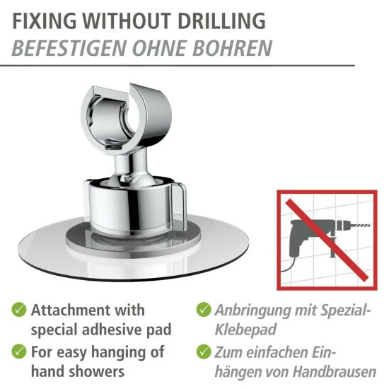 Die Anbringung des Duschkopfhalters gelingt innerhalb von Minuten mithilfe eines Spezial-Klebepads, das Sie ganz leicht an der gewünschten Stelle anbringen können. Geeignet ist das Klebepad für alle glatten, luftundurchlässigen Oberflächen wie zum Beispiel Fliesen oder Glas. Auch nach vielen Jahren der Nutzung lässt sich der Duschkopfhalter samt Kleber rückstandslos wieder entfernen.