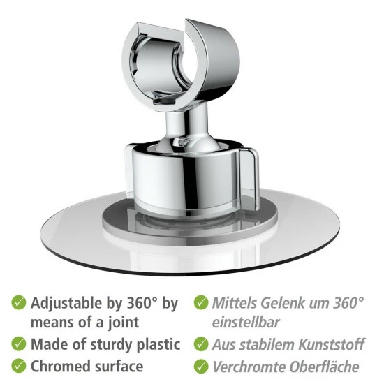 Mit (B/T x H): Ø 8 x 7,5 cm ist der hochwertige Duschkopfhalter eine handliche Ergänzung zur Duscheinrichtung. Stellen Sie die Handbrause so ein, wie es für Sie am angenehmsten ist. Das gelingt ganz leicht, denn der Duschkopfhalter ist mit seinem Gelenk um 360° einstellbar.