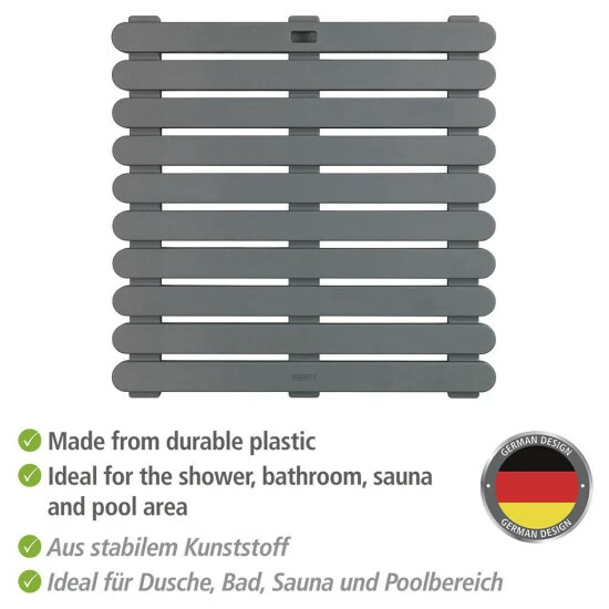 Der stabile Duschrost aus Kunststoff in modernem Grau ist ein praktisches Pad aus rutschfestem Material und verhindert ein Verrutschen auf nassen und glatten Oberflächen. Egal, ob indoor oder outdoor: die Duschmatte vermittelt ein sicheres Gefühl und hält die Bodenkälte fern. Mit der komfortablen Größe von 55 x 55 cm und der schönen Holzbretter- Optik passt sie in jedes Badezimmer und dient als sehr praktisches und modernes Einrichtungselement.