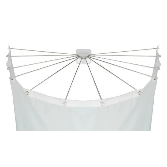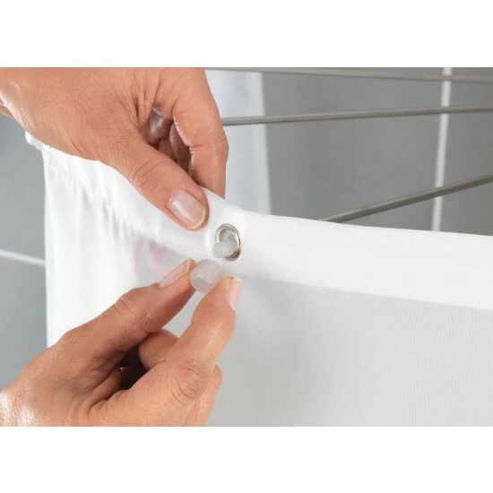 Geeignet ist die clevere Halterung für alle handelsüblichen Duschvorhänge mit 12 Ösen in 180 cm Breite.