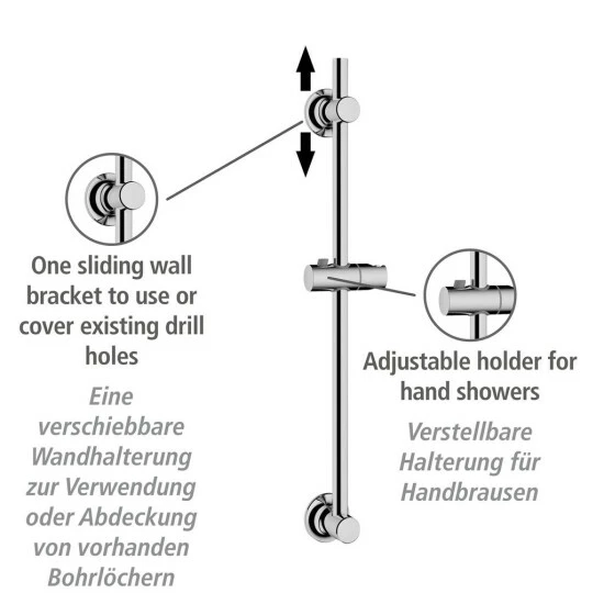 Die Duschstange wird mittels Spezial-Klebepads an den Wandhaltern befestigt. Besonders praktisch: Einer der Wandhalter ist individuell verschiebbar, sodass unter Umständen bestehende Bohrlöcher verdeckt werden können. Die Stange ist auch nach vielen Jahren der Nutzung rückstandslos entfernbar. Alternativ kann die Duschstange auch konventionell mit den beiliegenden Schrauben und Dübeln an der Wand montiert werden.