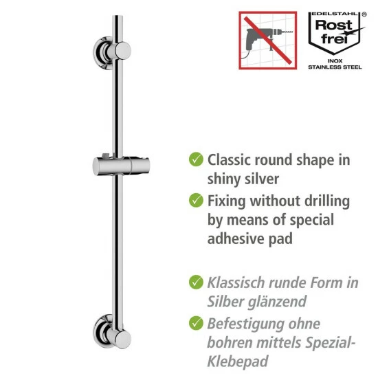 Wer Bohrlöcher vermeiden möchte oder muss, liegt mit der Duschstange ohne Bohren von WENKO in Chrom genau richtig. Wie der Name schon verrät, gelingt die Montage der Brausestange ganz ohne die Bohrmaschine! Innerhalb von Minuten wird die Stange mithilfe eines Spezial-Klebepads und innovativen Wandhaltern an der gewünschten Stelle befestigt.