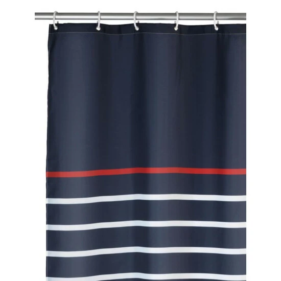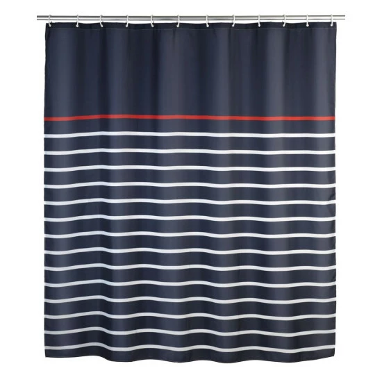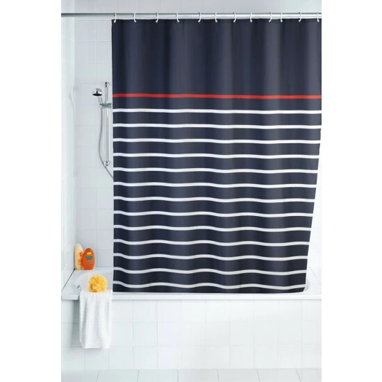 Der Duschvorhang Marine bietet eine gelungene Abwechslung im grauen Badezimmeralltag. Der blau-gestreifte Vorhang eignet sich mit einer Breite von 180 cm sowohl für Duschen als auch Badewannen.