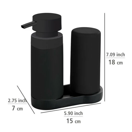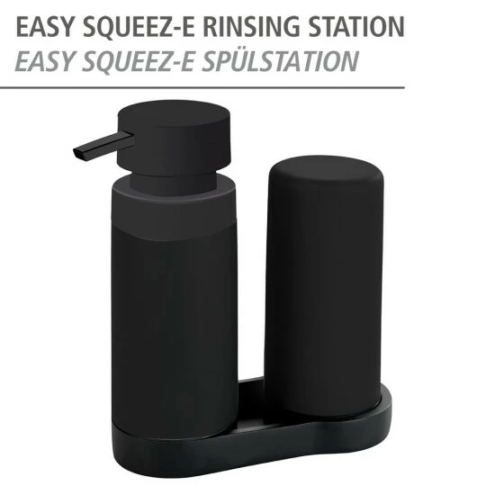 Ordnung halten leicht gemacht – mit der praktischen Easy Squeez-e Spülstation von WENKO. Diese clevere Kombination aus Seifen/Spülmittelspender und Easy Squeez-e-Dosierer bringt im eleganten Schwarz Stil und jede Menge Funktionalität in die Küche. Auf der Ablage werden beide Spender griffbereit am Spülbecken gehalten. Das schmale Design nutzt den engen Raum hinter den meisten Spülen voll aus.