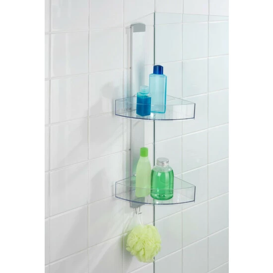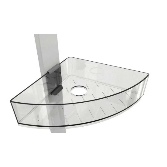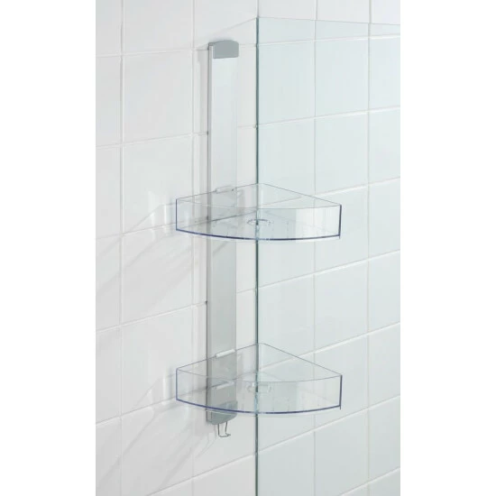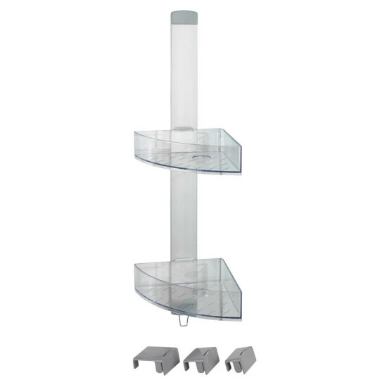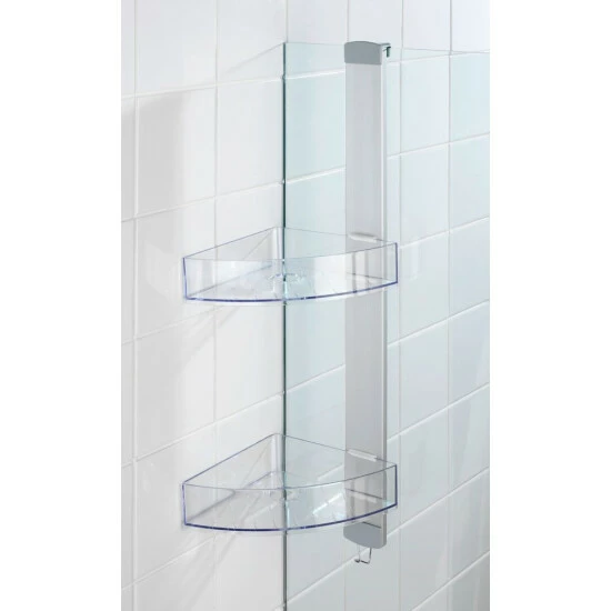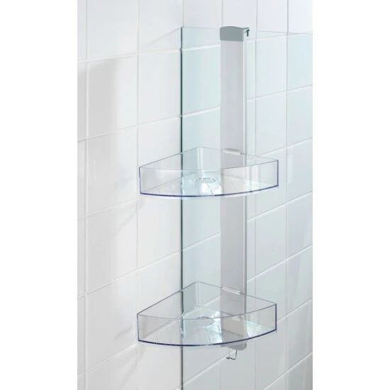 Das hochwertige Eck-Regal in mattem Silber und Transparent, passt platzsparend in jede Ecke. Mit den zwei komfortablen Ablagen bietet dieses Badregal viel Platz für Shampoo, Seife, Schwämme oder andere Bad-Accessoires. Beide Regalablagen verfügen über jeweils ein Loch für kopfüber aufbewahrte Shampoos. Zugleich dienen die Löcher als Wasserablauf. Zudem sind die Ablagen seitlich verschiebbar.