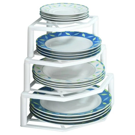Die praktische Teller-Eckablage bietet Ihnen drei Etagen, auf denen Sie Suppenteller, flache Teller, Frühstücksteller oder auch Dessertteller platzieren können. Schaffen Sie auf diese Weise mehr Ordnung in Ihrem Geschirr.