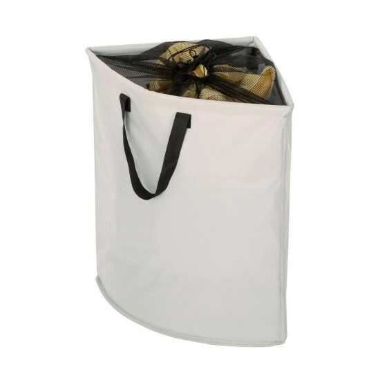 Praktischer, platzsparender Ecksammler in Hellbeige Strapazierfähiges Polyester mit Trageriemen und Sichtschutzabdeckung Alternativ auch als Aufbewahrungsbox einsetzbar Fassungsvermögen: 75 Liter Größe ca. (B x H x T): 55 x 60 x 40 cm Artikelnr. 3440006100 Artikel ist in einer einfachen Folie verpackt. Größe verpackt ca. 41x41x4 cm