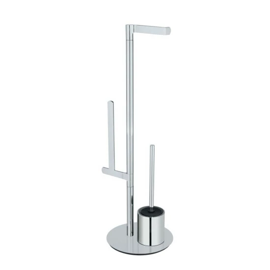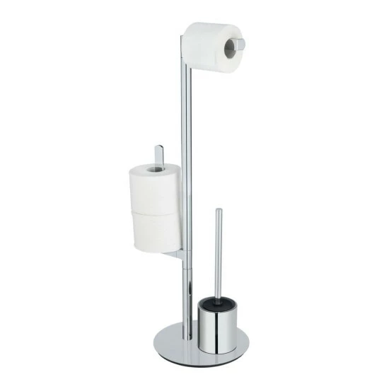Die Stand WC-Garnitur besteht aus rostfreiem Edelstahl. Das praktische 3-in-1-Ensemble beinhaltet eine Garnitur mit Toilettenbürste, einen Toilettenpapierhalter und einen Halter für Ersatzrollen. Die Elemente sind auf einer schweren Bodenplatte vereint, die für einen sicheren Stand sorgt. Die platzsparenden Maße von insgesamt (B x H x T): 29 x 79 x 25 cm ermöglichen eine problemlose Platzierung neben der Toilette im Badezimmer oder Gäste-WC.