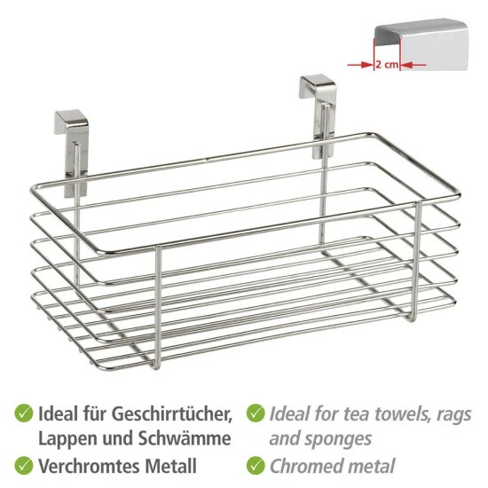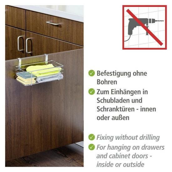 Besonders eignet sich das Multi-Talent für die übersichtliche und griffbereite Aufbewahrung von Geschirrtüchern, Lappen und Schwämmen im Küchenschrank unter der Spüle. Der dekorative Sammler aus verchromtem Metall wird einfach an Schublade oder Schranktüre innen oder außen eingehängt.