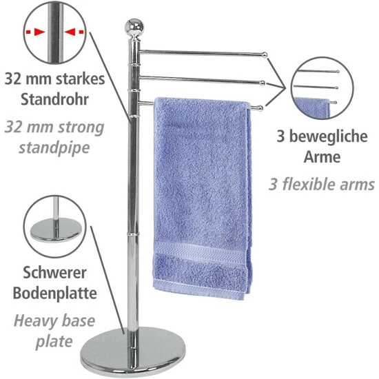 WENKO Handtuchständer Exclusiv, freistehender Ständer mit 3 beweglichen Armen, Kleiderständer aus Metall mit moderner, glänzender Chrom Ummantelung, 28,5 x 90 x 48,5 cm, verchromt