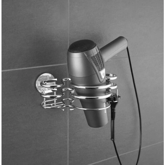 Mit dem eleganten Haartrocknerhalter Cali hat der Föhn stets einen festen Platz und ist jeden Morgen schnell griffbereit. Zusätzlich bietet der Föhnhalter auch Platz für ein Glätteisen oder einen Lockenstab. In der weiteren Halterung kann eine Flasche Fönlotion oder Festiger aufbewahrt werden. Der Stecker wird einfach an dem integrierten Kabelhalter eingehängt, um lästiges Verknoten zu vermeiden.