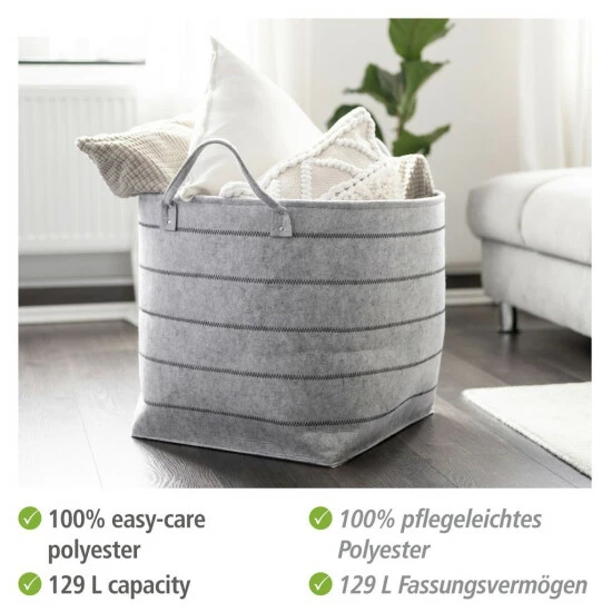 Gefertigt ist der Filzaufbewahrungskorb Nella aus 100 % pflegeleichtem Polyester. Das Wohnaccessoire bietet auf 129 Litern großzügig Stauraum und misst (B x H x T) 58 x 49 x 58 cm. Auch im Schlafzimmer und im Kinderzimmer können Sie den Textilien Halter bequem nutzen. Sie benötigen für Ihre Schals und Mützen noch einen nützlichen Platz? Platzieren Sie den Ordnungshelfer, dessen Boden 45 x 45 cm misst, doch gleich im Eingangsbereich!