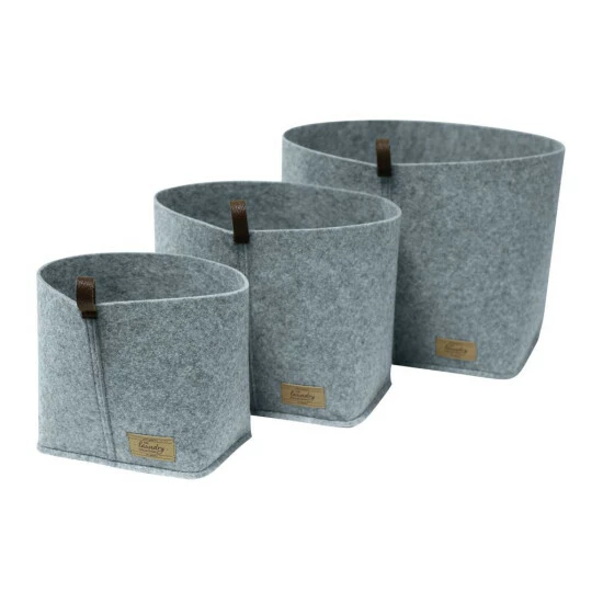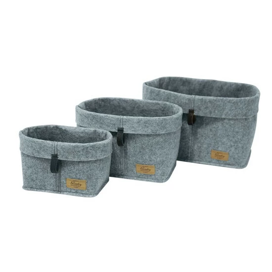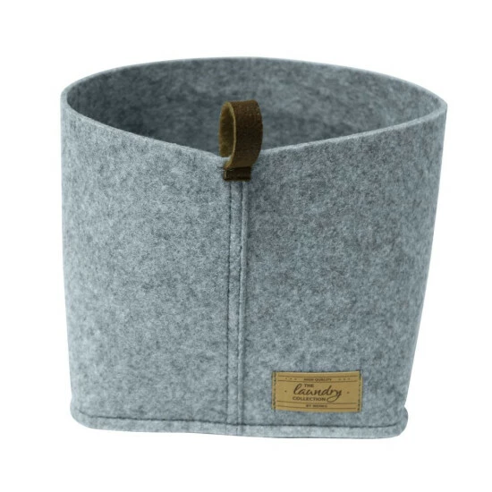 Die stylischen Aufbewahrungskörbe in hellem Grau überzeugen in außergewöhnlich stimmigem Design. Versehen mit einer braunen Schlaufe aus Kunstleder und einer kleinen Applikation, fügt sich der harmonisch gestalteten Filz Korb in jedes Interior ein. Die umgeschlagene Krempe wertet die schlichte Gestaltung auf und rundet die optimal designte Formgebung ab. Auf diese Weise wird der Behälter mit seinen geraden Linien offen präsentiert zum absoluten Hingucker.