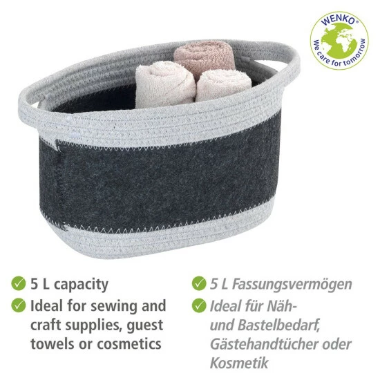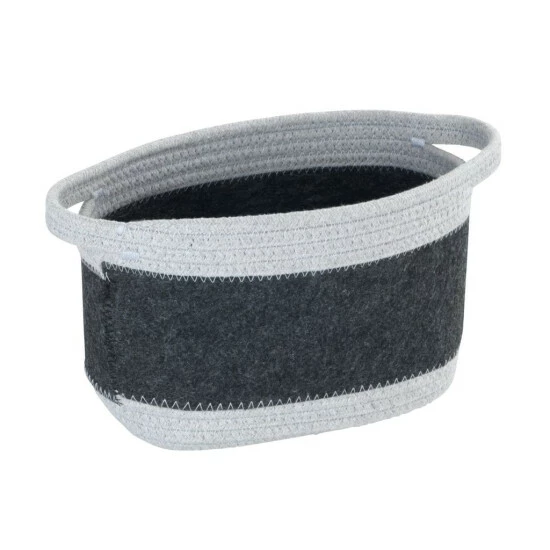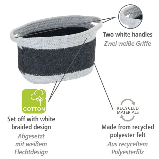 Der schicke Filzkorb Bea M ist am Boden sowie oben mit einem ansprechenden Flechtdesign aus 80 % hellgrauer Baumwolle und 20 % Polyester versehen. Die engmaschige Flechtstruktur arbeitet in gleicher Materialzusammensetzung hervorragend die beiden handlichen Griffe aus, mit denen der Tragekorb ausgestattet ist. In der Mitte präsentiert sich der Korb mit einer dunkelgrauen Filzfläche aus Polyester. Die hellgraue Strickoptik bildet einen ansprechenden Rahmen und hebt optisch den dunkelgrauen recycelten Polyester-Filz ab. Die optimale Maße hat der Korb mit zwei Griffen mit (B x H x T): 24 x 16 x 16 cm ebenfalls.