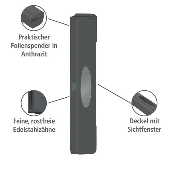 Mit seinen feinen, rostfreien Edelstahlzähnen durchtrennt der Folienschneider Frischhaltefolien und Alufolien mühelos, ohne zerreißen. Einfach die Folie herausziehen, auf Spannung halten und den Spender zusammendrücken. Die fein gezahnte Edelstahl-Klinge im Deckel trennt sie sauber ab, zusammengeklebte Folienstücke gehören der Vergangenheit an.
