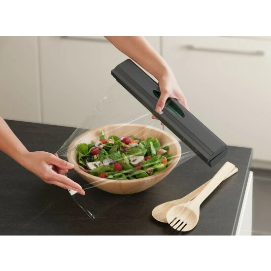 - Sauberer Schnitt: Einfach die Folie herausziehen, auf Spannung halten und den Spender zusammendrücken, die fein gezahnte Edelstahl-Klinge im Deckel trennt sie sauber ab