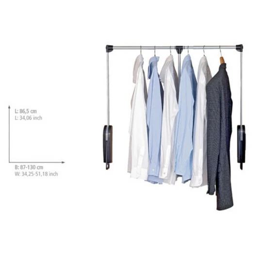 Der teleskopische Garderobenlift ist für Schrankinnenmaße von 87-130 cm geeignet und verfügt über eine Soft-Rücklauf-Automatik. Das Montagematerial ist im Lieferumfang enthalten.