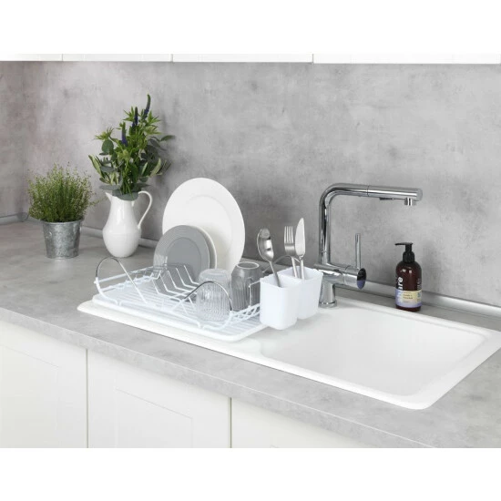 Kompakt, ordentlich und schönes für alle, die keine Geschirrspüler haben. Oder sie wollen sie nicht laufen, um nur ein paar Teller zu waschen. Abfluss auf der Spüle, mit profilierten Griffen. Dank dessen, trotz seiner prosaischen Funktion, sieht es sehr schön aus. Diejenigen, die einen Tropfen auf die Arbeitsplatte legen möchten, haben auch kein Problem damit. Es ist mit einem maßgeschneiderten Tablett ausgestattet, zu dem Wasser aus dem Trockengeschirr fließt. Für mehr Benutzerfreundlichkeit ist der Tropfer mit einem Seitenbehälter für Besteck ausgestattet. Das Farbschema ist eine universelle und klassische Kombination von Weiß mit Stahlsilber. Es funktioniert fast überall, zumal die meisten Küchen mit Waschbecken oder Haushaltsgeräten in diesen Farben ausgestattet sind.