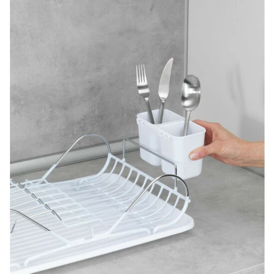 Der Geschirr-Abtropfer mit exklusiver Kunststoff-Beschichtung und Anti-Rutsch-Effekt bietet viel Stellplatz für Teller, Tassen oder Gläser. Der separate Besteckkorb wird seitlich am Regal befestigt.