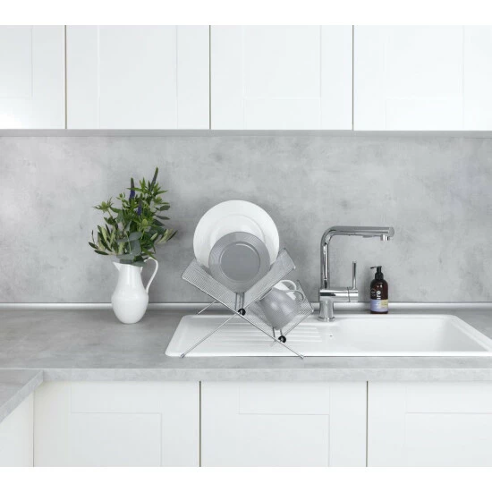 Durch die kreuzförmige Konstruktion finden Teller auf der oberen Ablagefläche optimalen Halt. Die seitliche Ablage bietet Platz für Tassen, kleinere Gläser oder Besteck. Bei Nichtgebrauch kann der Geschirrabtropfer platzsparend zusammengeklappt werden.