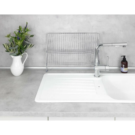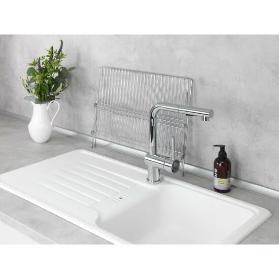 Der praktische Geschirrabtropfer Duo aus verchromtem Metall bietet mit seinen großen Ablageflächen viel Platz für Teller und Geschirr. Da es auch im Zeitalter der Spülmaschine immer noch Geschirr und Besteck gibt, das besser von Hand gespült werden sollte, dient er als funktionelles Zubehör für die Spüle in Küche, Gartenhaus oder Wohnmobil.