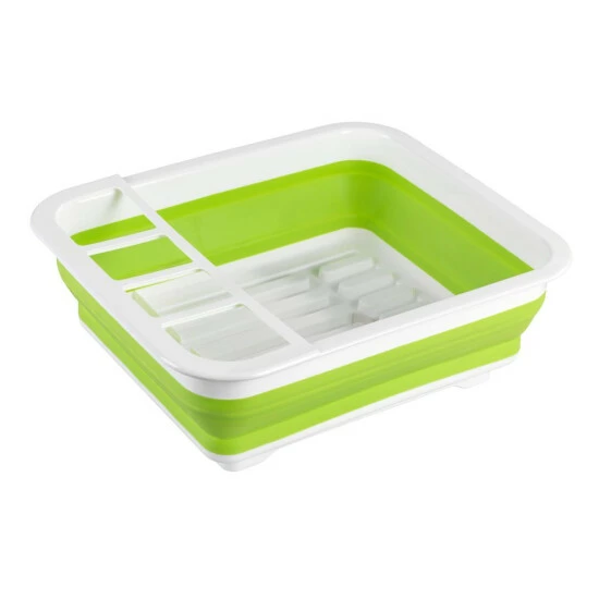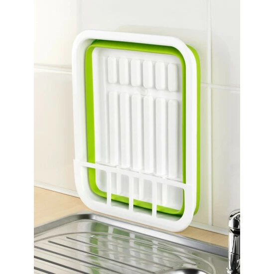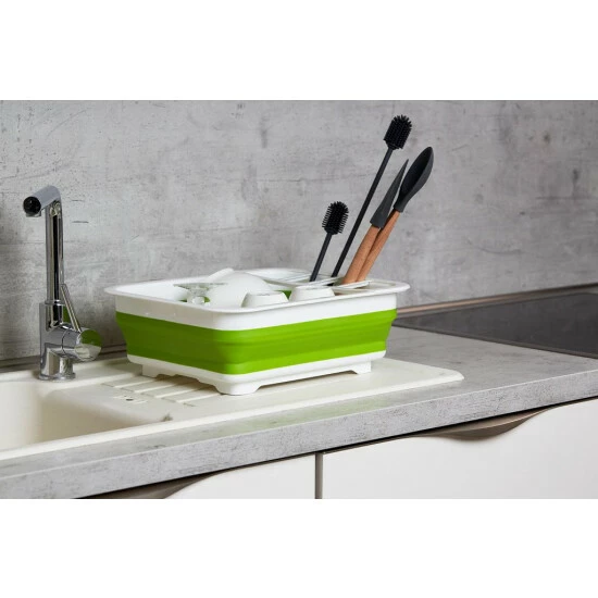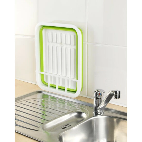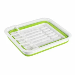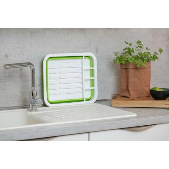 Das handliche Abtropfgestell ist im modernen Grün/Weiß gehalten und lässt sich bei Nichtgebrauch platzsparend zusammenfalten. Einfach den Stopfen entfernen und das gesammelte Wasser durch den drehbaren Ablauf in die Spüle laufen lassen.