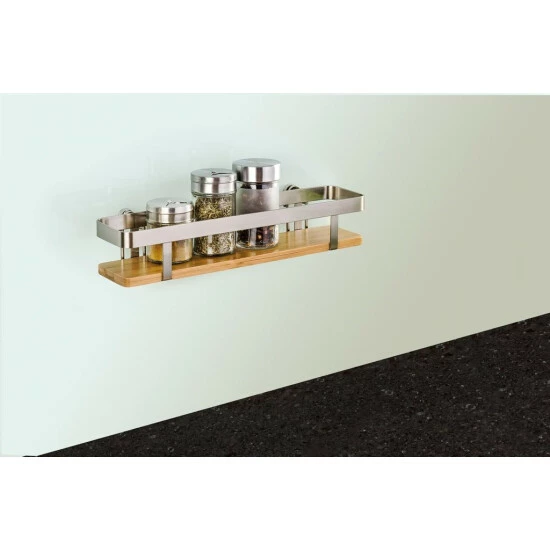 In dem dekorativen Gewürzbord der WENKO Premium-Serie aus hochwertigem, gebürstetem Flachstahl sind alle Gewürze beim Kochen stets griffbereit aufbewahrt. Das Regal mit einer Ablagefläche (30 x 7 cm) aus modernem Bambus bietet ausreichend Platz für bis zu sechs handelsübliche Gewürzbehälter. Natürlich finden auch Flaschen (Öl, Essig, etc.), weitere Dosen und viele Küchenhelfer eine attraktive Aufbewahrungsmöglichkeit in Griffnähe. Das macht das Küchen-Bord zu einem nützlichen Helfer in jeder Küche.