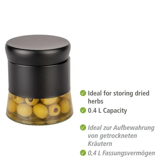 Die Aufbewahrungsdose Boga von WENKO ist die ideale Ergänzung am Grill. Mit ihren 400 ml Fassungsvermögen und dem ansprechenden Design ist sie am Grill und auf dem Tisch ein echter Hingucker. Gefertigt aus transparentem Glas und kombiniert mit rostfreiem Edelstahl in Schwarz bewahrt die Dose mit Deckel Gewürze optimal auf. Der Deckel ist aus hochwertigem Kunststoff gefertigt. Durch den Schraubverschluss ist die Gewürzdose zudem leicht zu öffnen und sicher zu verschließen. Die ideale Ergänzung ist die Glasdose Boga mit 600 ml Volumen, hier finden auch Snacks wie Oliven einen ansprechenden Aufbewahrungsplatz.