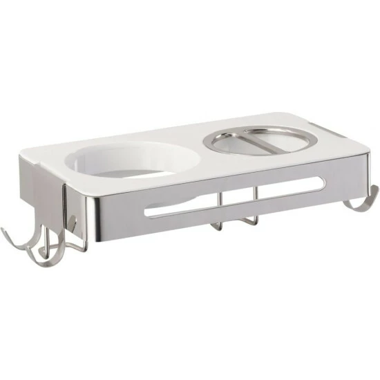 Eine elegante Halterung für einen Fön und einen Haarglätter aus der Premium Plus Zubehörserie. Ausgestattet mit zwei Löchern für Ausrüstung und Haken für Stromkabel. Es wird Ihr Zubehör immer zur Hand haben und an einem sicheren Ort abkühlen. Hochwertiger, glänzender Edelstahl. Ideal für Zuhause, Friseursalon, Hotel oder Erholung und Sportanlagen. Befestigung mit den beigefügten Schrauben und Dübeln. Es ist möglich, ohne Werkzeuge und Bohren zu montieren. Vakuum-Loc-, Turbo-Loc- und Power-Loc-Adapter sollten separat erworben werden.