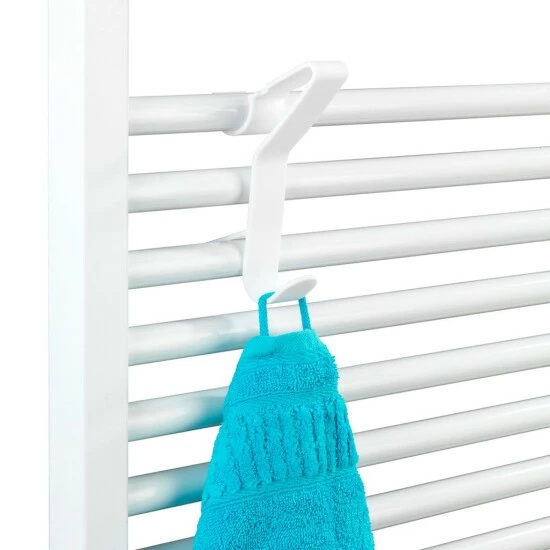 Der Haken wird einfach an dem Rundrohrheizkörper zwischen den Stangen eingehängt und sitzt fest ohne zu verrutschen. So sind Handtücher & Co. stets griffbereit!