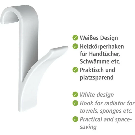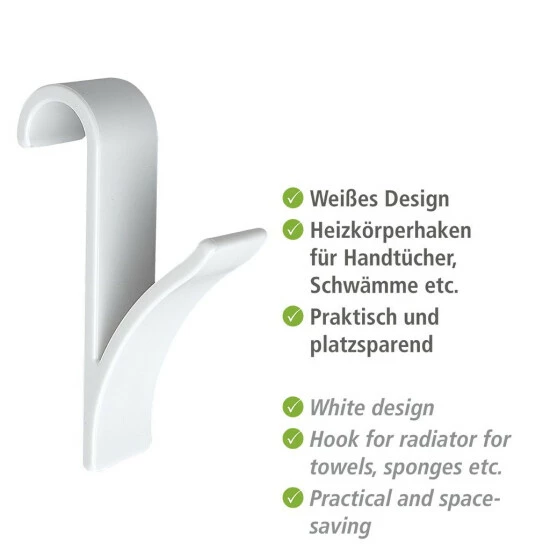 - Lieferumfang: Komfortables 2er Set Heizkörperhaken in dezentem Weiß/Chrome oder Transparent von WENKO, Maße (B x H x T): je 2,5 x 10,5 x 7 cm