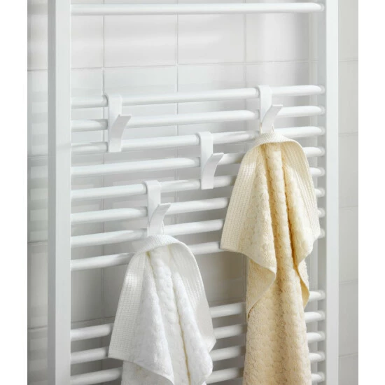 Die Haken werden ganz einfach an die Stangen des Handtuchwärmers gehängt. Nebeneinander oder auch versetzt halten sie die Handtücher an gewünschter Stelle stets griffbereit.