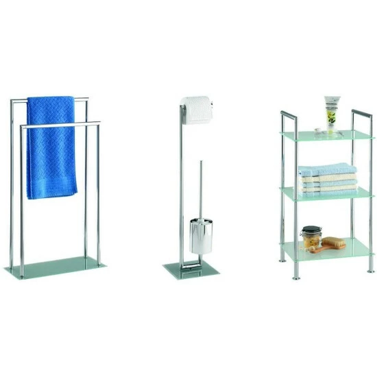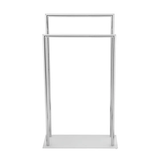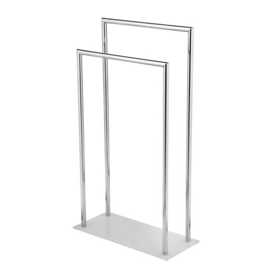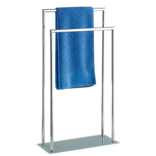 Die hochbelastbare Bodenplatte aus mattiertem Sicherheitsglas gibt dem freistehenden Handtuchhalter einen festen Halt.