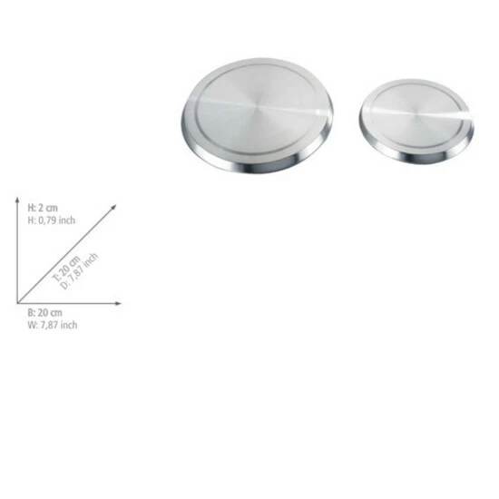 Wenko Abdeckplatten Diese vier praktischen Abdeckplatten sind zuverlässig und schützen Ihren Herd. Ihre hochwertige, matte Edelstahloptik macht sie zu dekorativen Elementen für die Küche. Sie können die Hüllen auch als Tischuntersetzer oder als Serviertablett für Kochlöffel verwenden. Das Set enthält vier Abdeckplatten in zwei Standardgrößen Spezifikationen: Farbe: matt silber Materiaa: Edelstahl Abmessungen Abdeckplatten: 20 x 2 cm (dxh) Abmessungen Abdeckplatten: 16 x 2 cm (dxh) Inhalt: 2 Abdeckplatten 20 x 2 cm (dxh) 2 Abdeckplatten 16 x 2 cm (dxh)