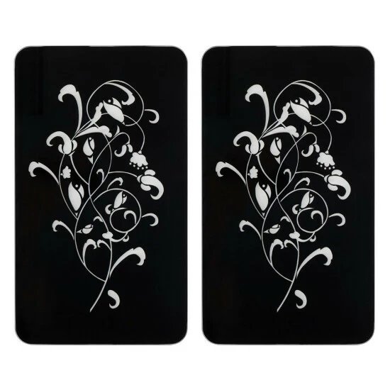2er-Set Kochfeld-Abdeckplatten ‘Ornamento Nero’. Diese Abdeckplatten schützen ihr Kochfeld (Ceran oder Induktion) zuverlässig vor Schmutz oder Beschädigung. Ihre kratzfeste, porenfreie Oberfläche erfüllt höchste hygienische Ansprüche. Sie verhindert das Einnisten von Bakterien und Gerüchen. Daher sind sie ideal als Schneidbrett im ‘Maxiformat’, zum Servieren am Party-Buffet oder zum Backen (Teig kneten, Teig ausrollen, Plätzchen ausstechen) nutzbar. Aus Glas: extrem robust und praktisch unzerbrechlich (schlagfest). Mit rutschfesten Silikonfüßen. Maße je Platte LxBxH: ca.52 x 30 x 1,8 cm.