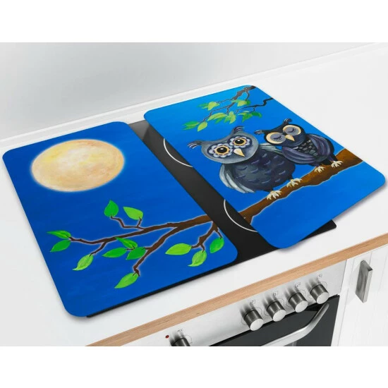 WENKO 2521455500 Herdabdeckplatte Universal Eule – 2er Set, für alle Herdarten, Gehärtetes Glas, 30 x 1.8-4.5 x 52 cm, Mehrfarbig