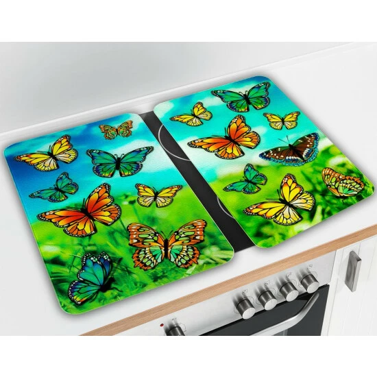 Ein Satz von zwei Platten aushochwertigem gehärtetem Glas mit dekorativen Grafiken verwandelt Ihr Kücheninterieur! Wenn Ihre Hausküche klein ist und Sie eine zusätzliche Arbeitsplatte benötigen, auf der Sie leckere Snacks für mehr Menschen zubereiten werden, dann ist ein Satz von zwei Glasplatten eine ausgezeichnete Lösung. Das Produkt ist so konzipiert, dass es auf der Oberfläche einer Gas-, Keramik- oder Elektroplatte platziert werden kann, und dank verstellbarer Füße können Sie es schnell und einfach an Ihre individuellen Bedürfnisse anpassen. Das Set besteht aus zwei Platten aus hochwertigem gehärtetem Glas. Jeder von ihnen ist mit attraktiven Grafiken von bunten Schmetterlingen auf der Wiese bedeckt. Das Produkt wird sicherlich einen Hauch von Farbe in das Kücheninterieur bringen und den Raum zu einer einzigartigen Atmosphäre machen. Die Glasplatte schützt die Oberfläche des Kochers perfekt vor Kratzern, mechanischen Beschädigungen sowie schwer zu entfernenden Schmutz.