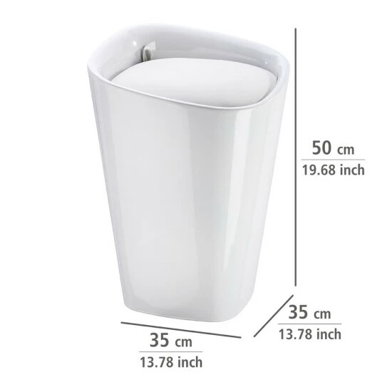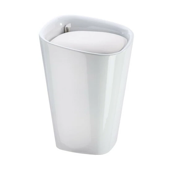Der trendige Badhocker und Wäschesammler Candy ist aus stabilem ABS-Kunststoff gefertigt. Mit seinem klassischen Weiß wird das moderne, eckige Accessoire zum Hingucker in jedem Bad.
