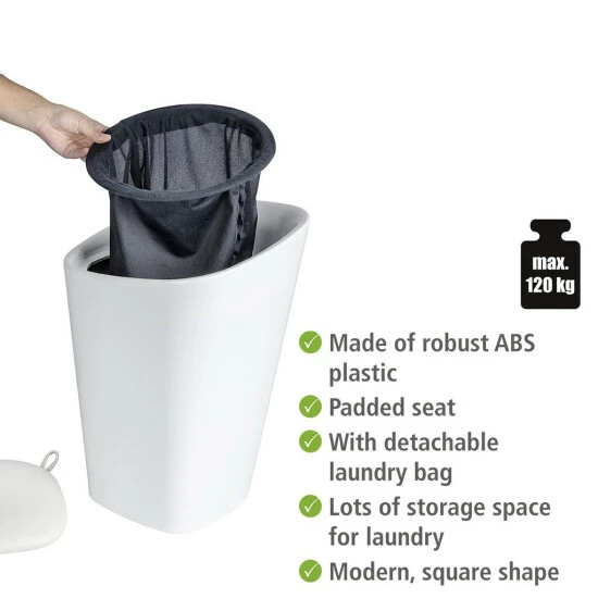 Viel Stauraum für Wäsche bietet der praktische Badhocker unter der Sitzfläche. In dem herausnehmbaren Wäschesack finden dekorativ 20 Liter Wäsche Platz bis zum nächsten Waschgang. Die großzügige, gepolsterte Sitzfläche lädt jederzeit zum Sitzen ein. Ebenso ist der Hocker auch als Ablagefläche geeignet.