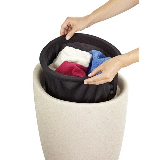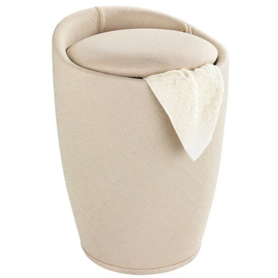 Viel Stauraum für Wäsche bietet der praktische Badhocker unter der Sitzfläche. In dem herausnehmbaren, schwarzen Wäschesack finden dekorativ 20 Liter Wäsche Platz bis zum nächsten Waschgang. Die großzügige, gepolsterte Sitzfläche lädt jederzeit zum Sitzen ein. Ebenso ist der Hocker auch als Ablagefläche geeignet.