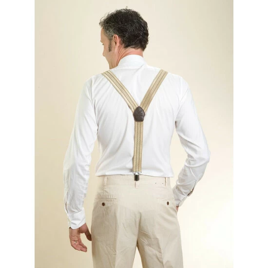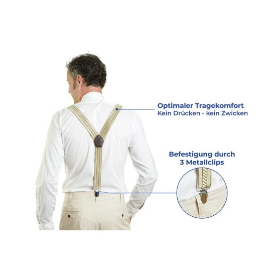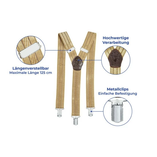 Die praktischen Hosenträger sind längenverstellbar bis max. 125 cm und werden mit Metallclips einfach befestigt. Alt und doch modern.