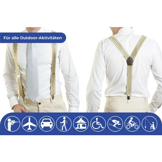 Hosenträger. Wenn die Hose rutscht und ein Gürtel nicht die richtige Lösung ist, dann greifen Sie doch zu diesen Hosenträgern in modischer Y-Form! Sie sind längenverstellbar (maximale Länge 125 cm) und lassen sich mit praktischen Metallclips befestigen. Material: Träger: 68% Polyester und 32% Latex. Metallclips aus robustem Stahl.